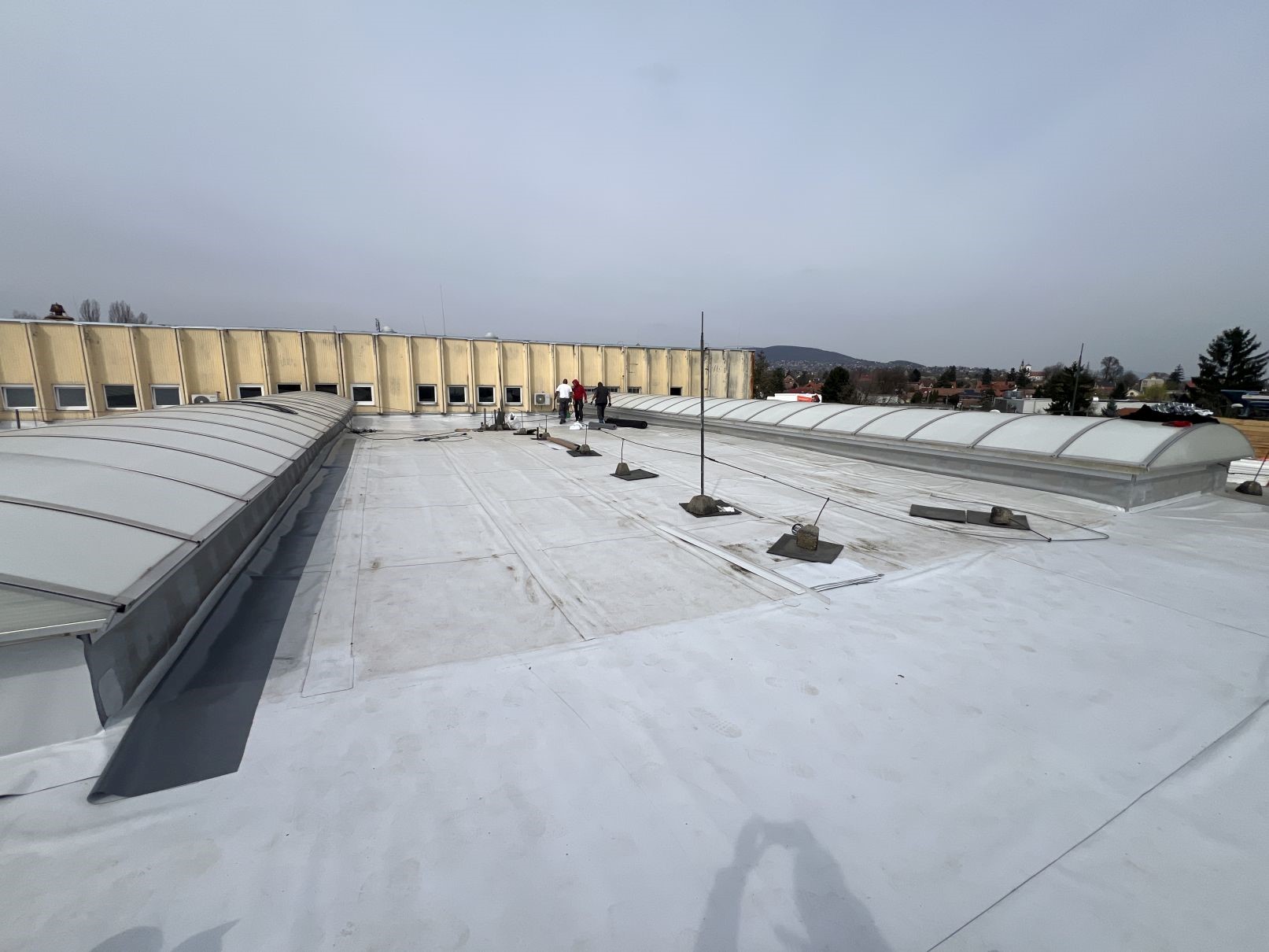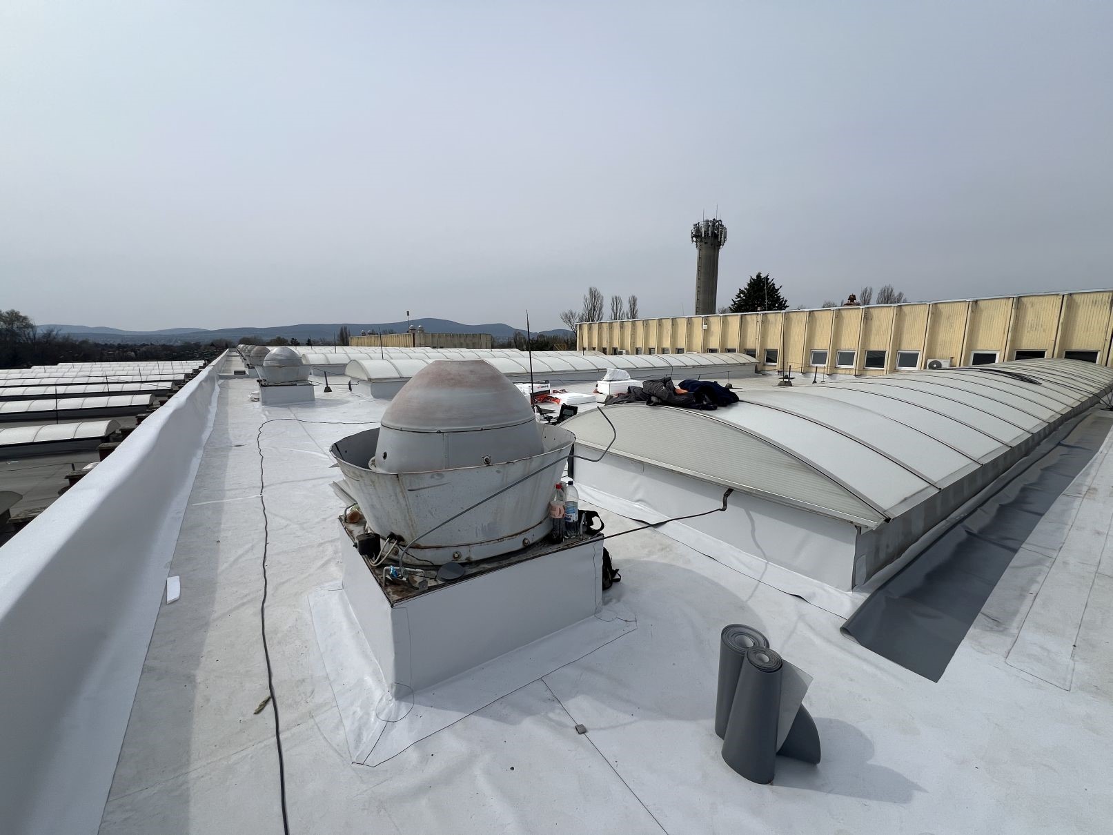 A szentendrei csarnoképület több mint 4000 m² tetőfelület, melynek korszerűsítése történt. Új PVC szigetelési és lejtéskorrekciós munkákat végeztünk a hosszú távú vízzáróság és üzembiztonság érdekében. A projekt keretében a meglévő rétegrend műszaki felülvizsgálatát követően új, korszerű hő- és vízszigetelő rendszer került kialakításra.